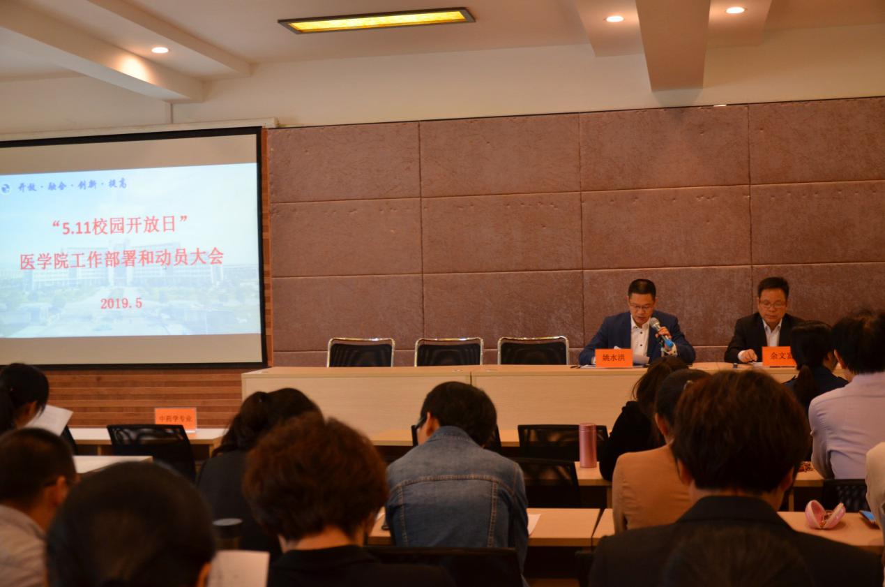 为积极配合学校“5.11校园开放日”系列活动顺利开展 ,明确医学院相关工作任务,统一认识,责任到人,5月8日下午2点,医学院于实训中心多功能报告厅召开相关工作部署与动员大会。医学院全体教职员工参加会议,医学院党总支书记余文富作工作部署与全体动员。会议由医学院院长姚水洪主持。