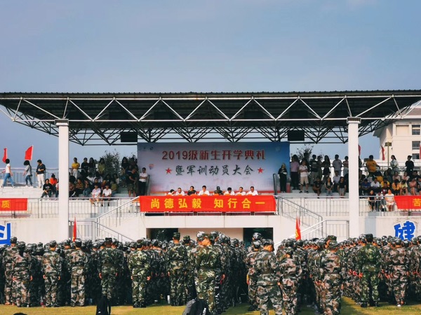 9月18日上午,我校在体育场举行2019级新生开学典礼暨军训动员大会。校领导、武警衢州市支队副参谋长李左灿出席,二级学院党政班子、辅导员、班主任、部队18名承训官兵、我校35名退役大学生组成的教官队伍及全体19级新生参加大会。大会由党委副书记王东升主持。