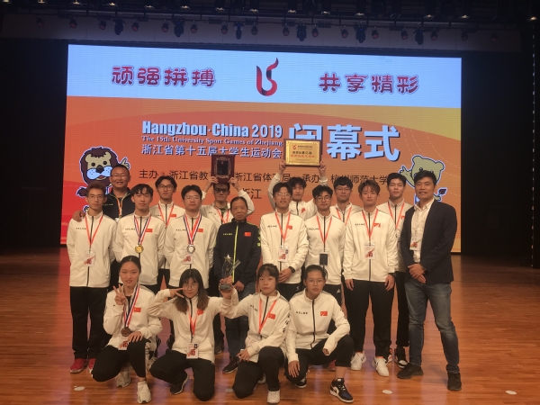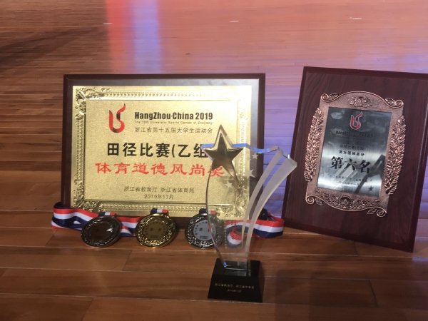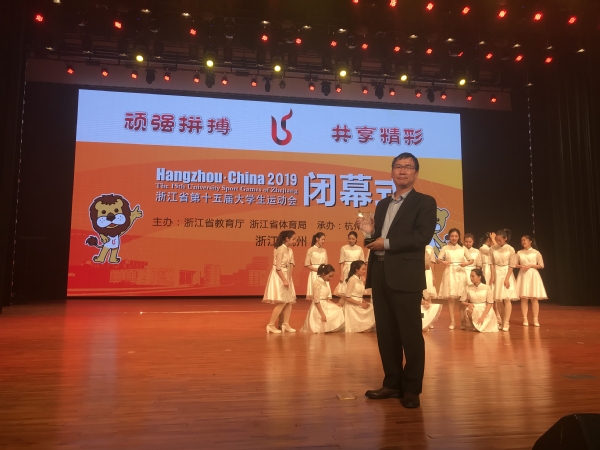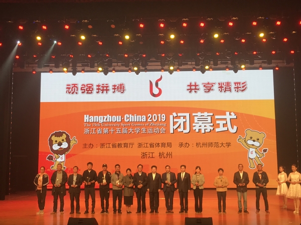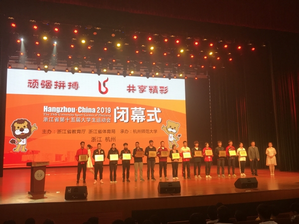 11月10日,浙江省第十五届大学生运动会在杭州师范大学圆满收官,本次大运会我校共参加了排球、羽毛球、健美操、武术、游泳、田径六个竞赛项目和一个阳光项目,共获得奖牌20枚,其中金牌14枚,银牌5枚,铜牌 3枚。同时,以团体总分第三名的优异成绩评为“校长杯”获奖单位。校党委副书记、校长江爱民出席闭幕式,并上台领奖。