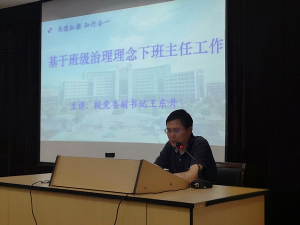 党委副书记王东升在会上专题报告,题为《基于班级治理背景下的班主任工作》,报告从班级治理的内涵、主要举措和基本要求三个方面阐述了新时代下班主任工作的新理念、新思路,并希望全体班主任、辅导员讲政治、讲公正、讲奉献,抓好当下“三件事”即抓好新生联络服务工作、抓好新生基本情况摸排工作、抓好新生第一课,继续改进学校班风、学风、校风,推进立德树人重重落地。