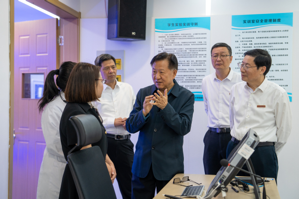 毛光烈一行走访了共富学院、校园数字中枢、工业互联网实训中心、四省边际大健康公共实训中心,详细了解我校人才培养、专业建设、服务地方发展等方面的工作,着重了解了人工智能赋能学校职业教育教学情况。