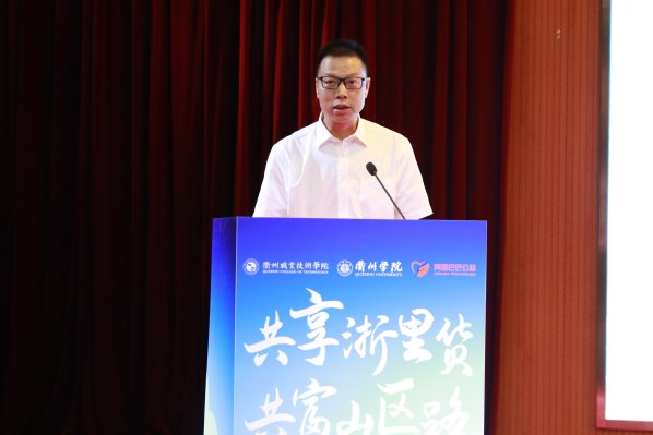 钟政致辞。钟政表示,此次“共享浙里货 共富山区路”活动,以“校企联动”为核心,与“钱江源品牌”的发展理念和实践路径高度契合。活动平台的搭建,将为开化县提供更广阔的销售渠道,让更多人了解和喜爱钱江源品牌农产品;AI公益的融入,也将为品牌推广和产品销售带来新的机遇和可能。期待与两校师生们携手合作,借助同学们的创新思维和专业技能,为乡村振兴注入新的活力。同时,期待与阿里巴巴公益共同探索“共谋、共建、共富”的县域合作新模式,让更多山区特色产品走出浙江,走向全国,为乡村全面振兴贡献更大的力量。